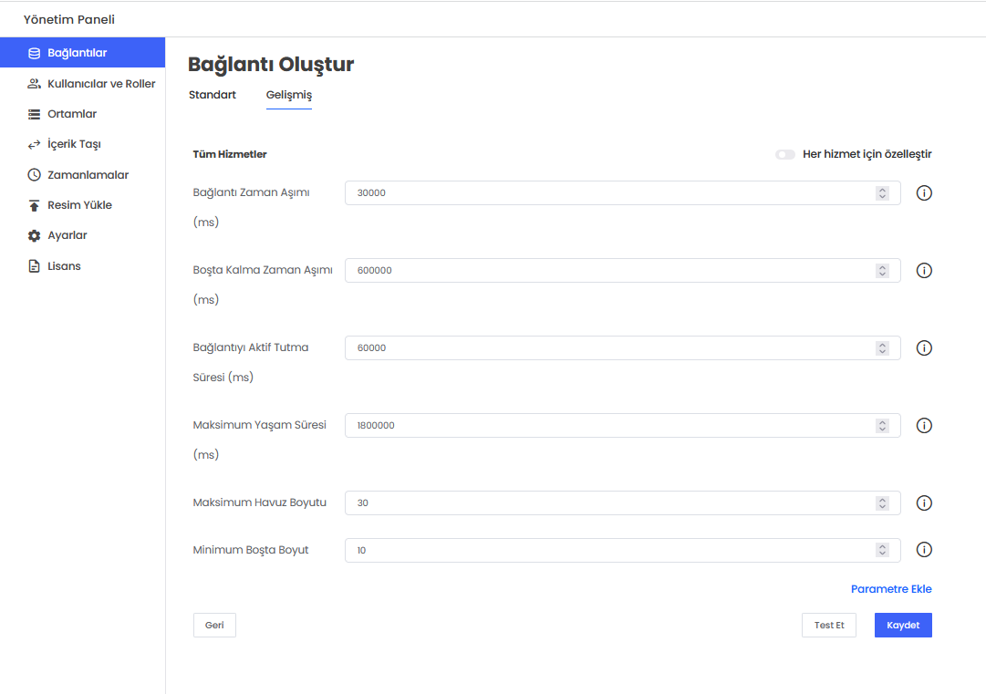 Bu özelliklere ek olarak ilgili bağlantı tipinin özellikleri dahilinde yeni parametrelerde eklenebilmektedir. Bunun için Parametre Ekle butonun tıklanması gerekmektedir. Butona tıklandığında özelliğin adı ve girilecek değer için 2 yeni alan ekleniyor olacaktır.