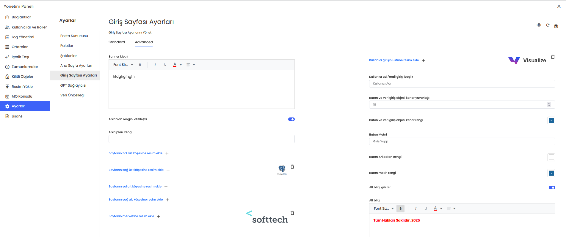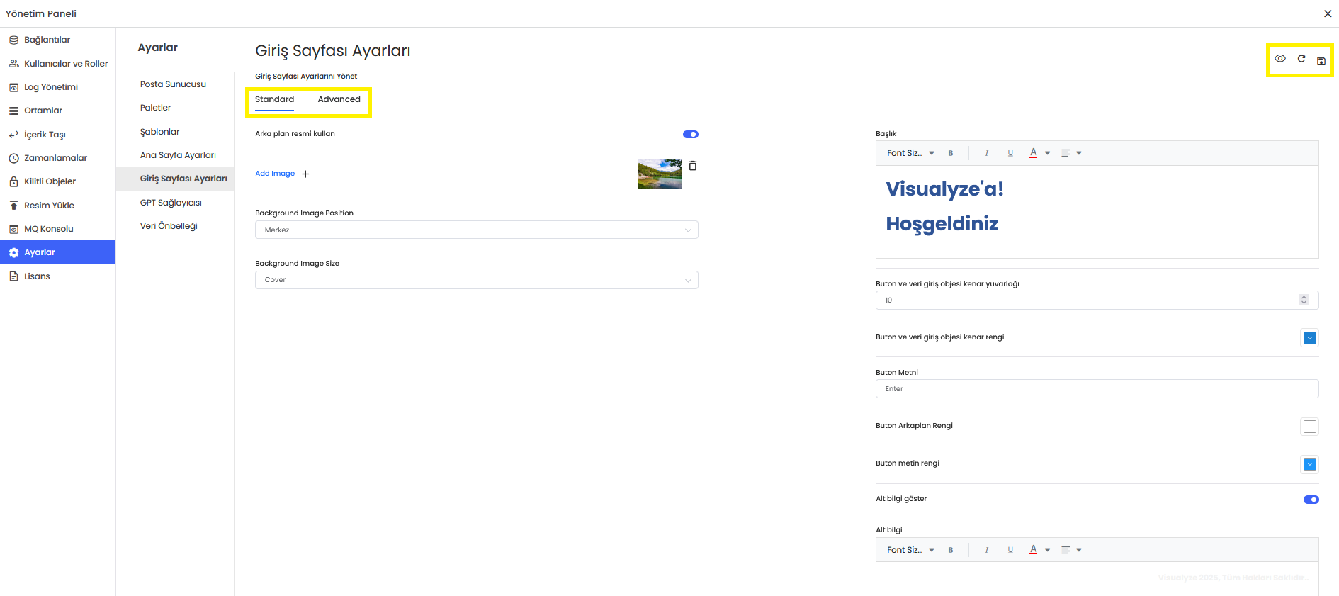 Uygulamaya giriş yaparken kullanıcı adı ve şifrenin girildiği ekranın tasarımı yönetim paneli -> ayarlar -> Giriş Sayfası Ayarları ekranından sağlanmaktadır. Bu ekrandan standart ve gelişmiş tema tasarımı sağlanmaktadır. Burada güncelleme yaptıktan sonra keycloak'tan da gelimiş veya standart tema seçimi kullanılmak istenen temaya uygun yapılmış olmalıdır. Özelliklerde değişiklik yaptıktan sonucu görmek için sağ üst köşedeki göz ikonuna tıklandığında yeni tasarım yeni sayfada açılmaktadır. Standart ve Gelişmiş tasarımın detayları şu şekildedir: