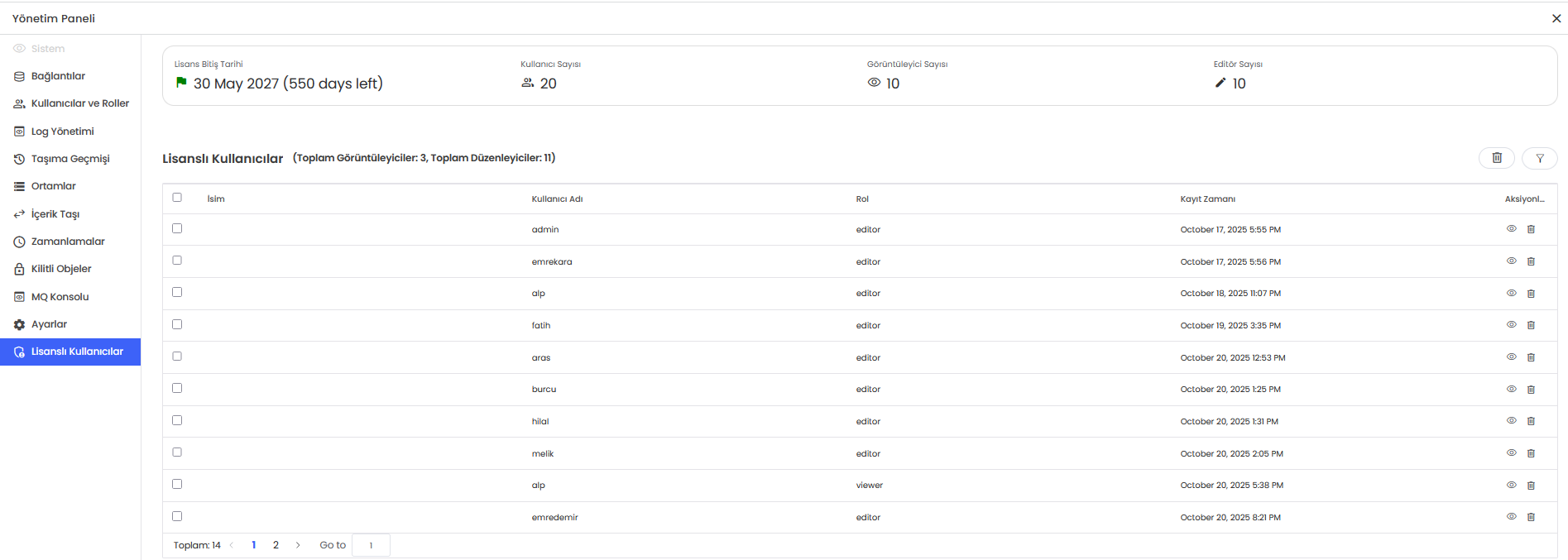 Uygulamadaki lisans yapısı şu şekilde çalışmaktadır: Bir kullanıcı uygulamaya giriş yaptığı anda lisanslanmaktadır. Bu ekranda da kullanıcı rolüne göre görüntüleme ve düzenleme lisansına sahip kullanıcılar listelenmektedir. Eğer ilgili kullanıcının artık uygulamayı kullanımı sonlanacaksa, en sağdaki silme ikonuna tıklanarak lisans listesinden çıkarılabilmektedir.
