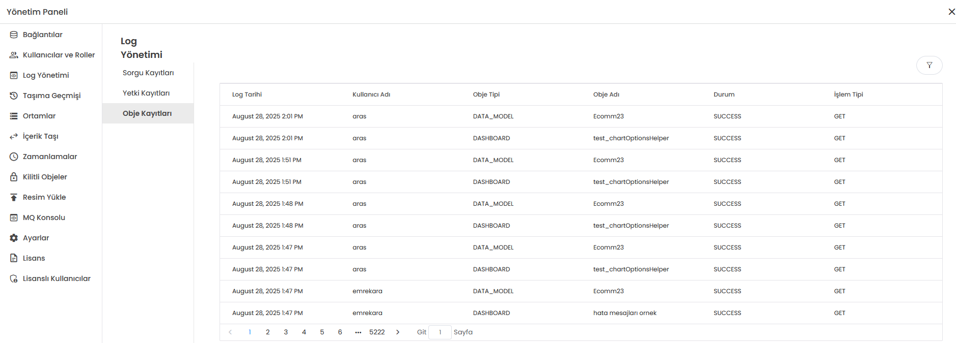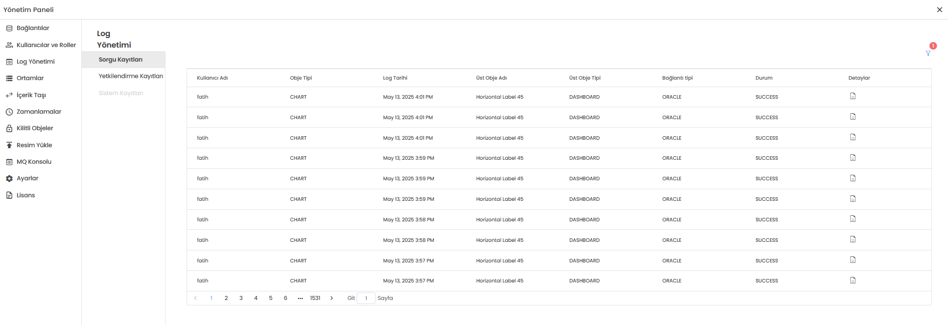 Log yönetimi ekranında sorgular, yetkilendirmeler ve obje giriş/çıkışlarının logları listelenmektedir. Her bir ekranın sağ üst köşesindeki filtre ikonuna basıldığında çıkan menü ile ekranlar detaylı filtrelenebilmektedir. Ekran içerikleri aşağıdaki gibidir:
