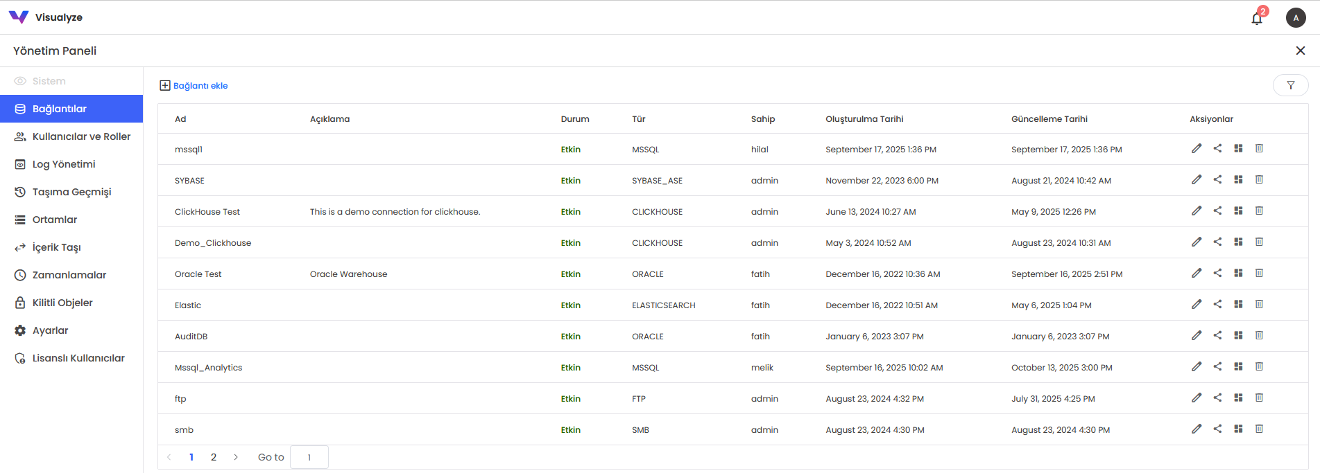 - Bağlantılar: Verimodeli oluşturmak için gerekli bağlantıların tanımlanmasını sağlar.