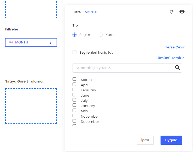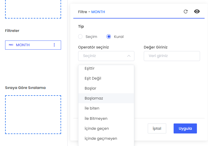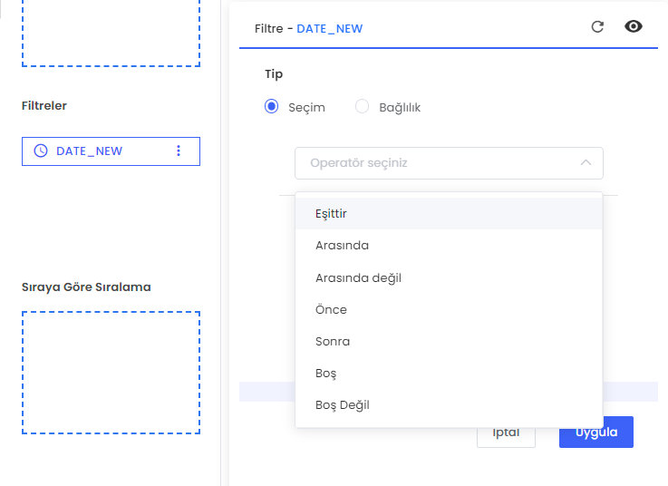 Filtre sekmesine sürüklenen alanlar üzerinden verinin filtrelenmesi sağlanmaktadır. Verinin tarih, özellik ve hesaplama tipinde olması durumlarına göre farklı filtreler mevcuttur. Aşağıda filtreleme ekranlarına ait örnekleri bulabilirsiniz. Burada herhangi bir filtre eklendiğinde ilgili grafikteki veri otomatik filtreli çalışmaktadır.