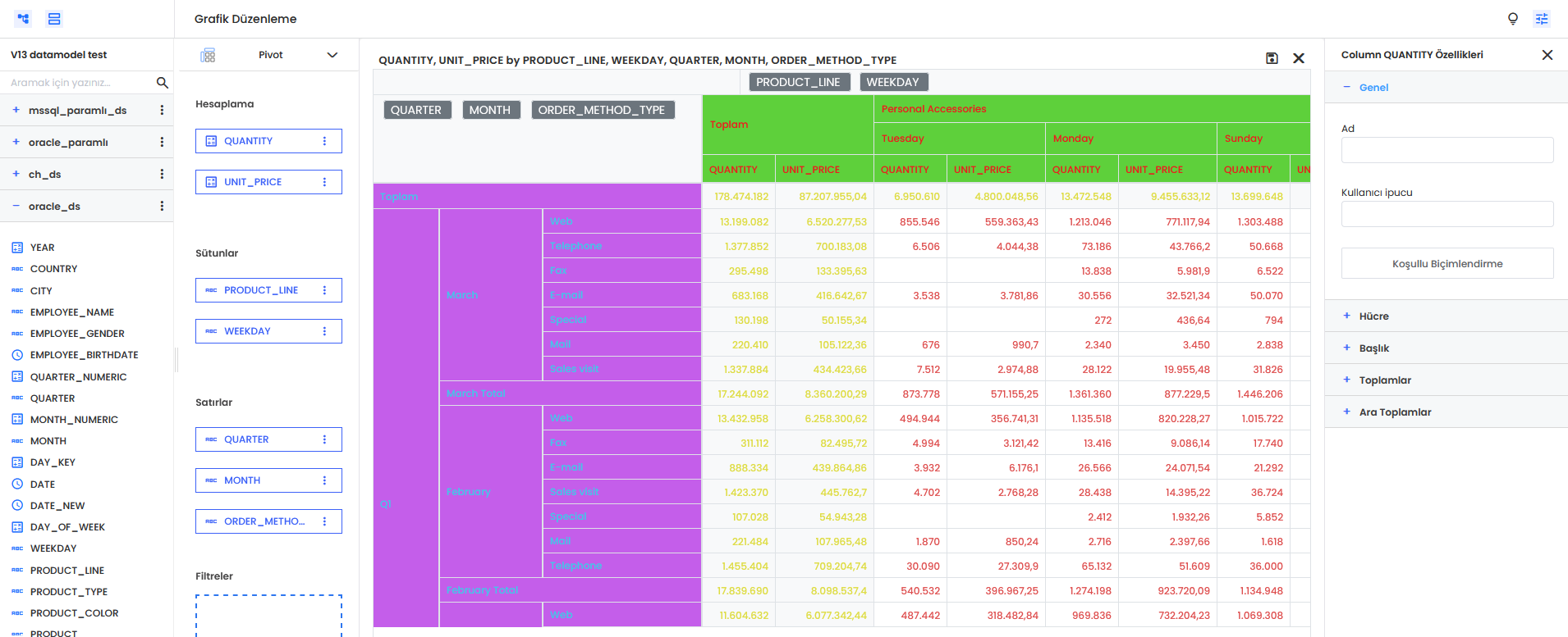 4.Toplamlar: Toplam seçenekleri içerisinden ilgili kolonun toplam gösteriminde seçilmek istenilen özetleme kuralları belirlenebilir. Özellik türündeki kolonlar içinde count, distinct count, min, max gibi dip toplamda özetleme kuralı seçimi yapılabilir.