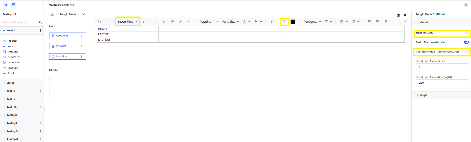 - Bu kullanım şekli özellikle html veri içeren alanları raporda göstermek için işlevseldir.Editör, html verileri gösterebildiği için seçilen filtreye göre