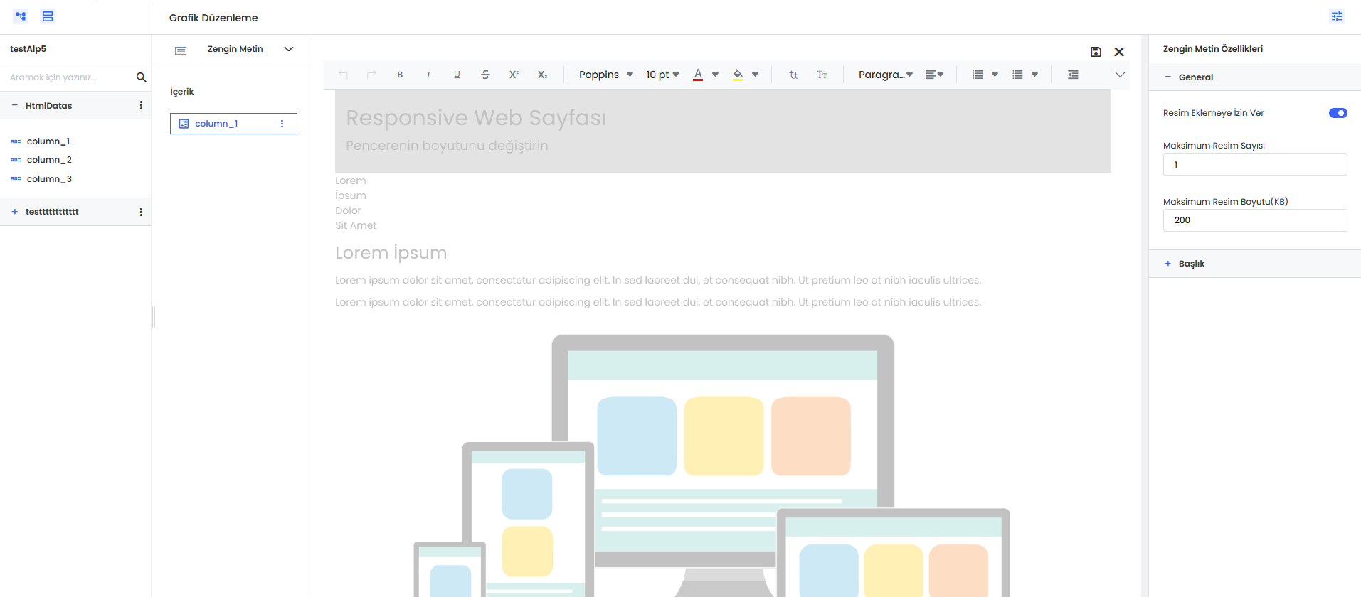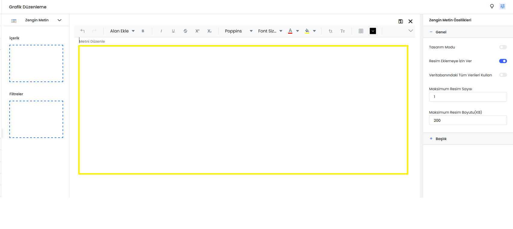 Aşağıdaki görselde sarı ile belirtilen kısıma istenilen metin eklenerek, editörün üzerindeki özellikler sayesinde görsel olarak daha detaylı düzenleme yapabilmeyi sağlamaktadır. Özellikle eklenen yazının font özellikleri daha detaylı güncellenebilmekte ve metin içerisine resim eklenebilmektedir.
